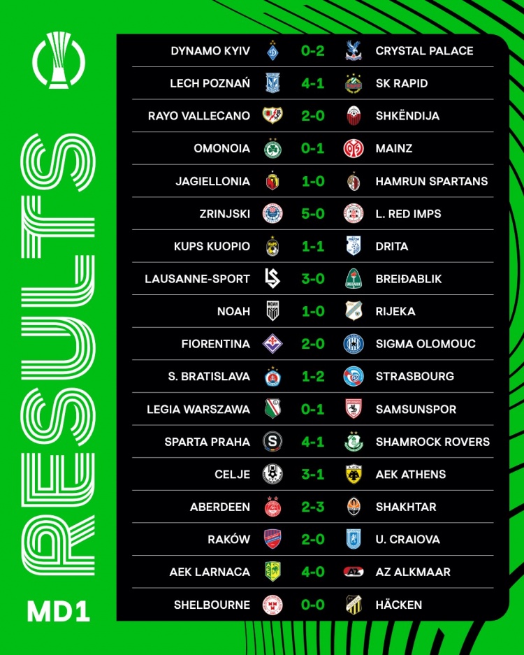 trận đấu vòng đầu tiên của Liên minh châu Âu, Crystal Palace đã đánh bại Dynamo Kiev 2-0, Vallecano, Fiorentina và Mainz Won và Alkmare thua 4 bàn.