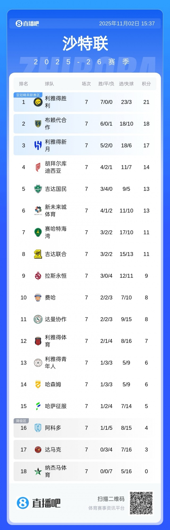 Bảng xếp hạng hiện tại của Giải VĐQG Ả Rập Xê Út