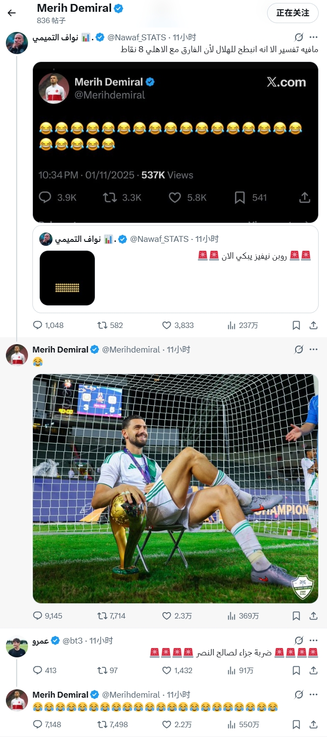 Sau khi chứng kiến VAR trao quả đá phạt đền quyết định cho Riyadh vào phút cuối, Ruben Neves và Malcom từng chơi cho Riyadh Crescent, cũng như Mahrez và Demiral từng chơi cho Jeddah National, đều đăng một loạt biểu tượng cảm xúc dở khóc dở cười lên mạng xã hội.