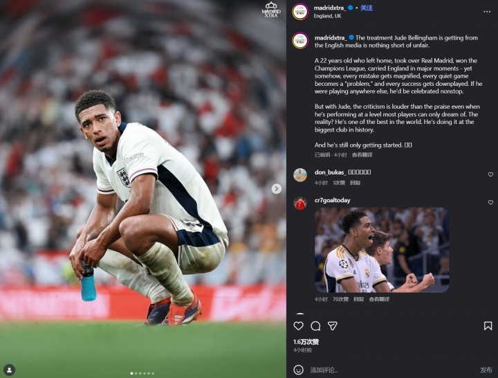 Trước đó, Anh đã đánh bại Albania với tỷ số 2-0. Bellingham được thay ra ở phút 84. Sau trận đấu, giới truyền thông đã bàn tán sôi nổi về phong độ cũng như sự không hài lòng của anh khi ra sân. Blogger MadridXtra liên quan đến Real Madrid đã đăng một bình luận trên mạng xã hội. Nội dung như sau.